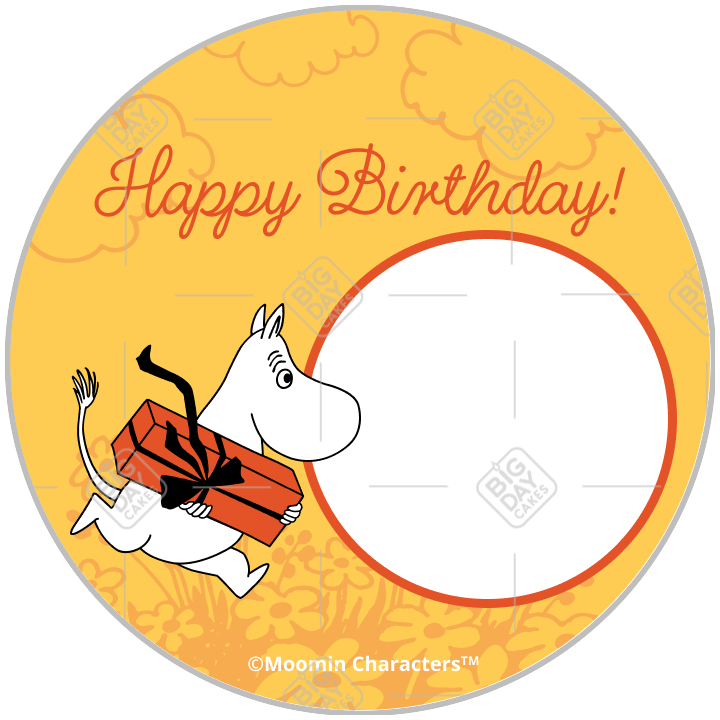 Moomin Happy Birthday cake topper with space for a photo and a personal message